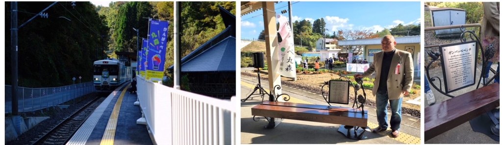 この開通を記念して、鍛鉄家 加成幸男製作の「ガンバッペベンチ」が設置されました。何かに行き詰ったら、ここに来て次の電車まで座っていると、たちあがる勇気が生まれるスポットです。以下のアイコンからFacebookグループページ「ガンバッペ!ノート」もしくはインスタグラム、Youtubeにアクセスし、どなたでも自由にFacebookに書込み、写真や動画投稿を、インスタ/Youtubeでは投稿へのコメントをお願いします。
