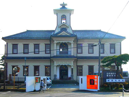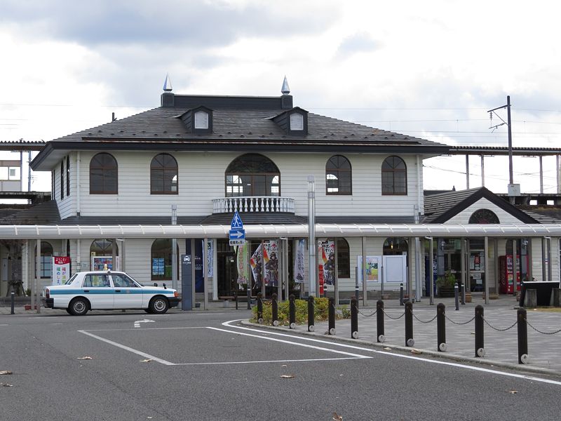 かつての伊達郡役所を再現した駅舎として2002年、東北の駅百選に選定された。
